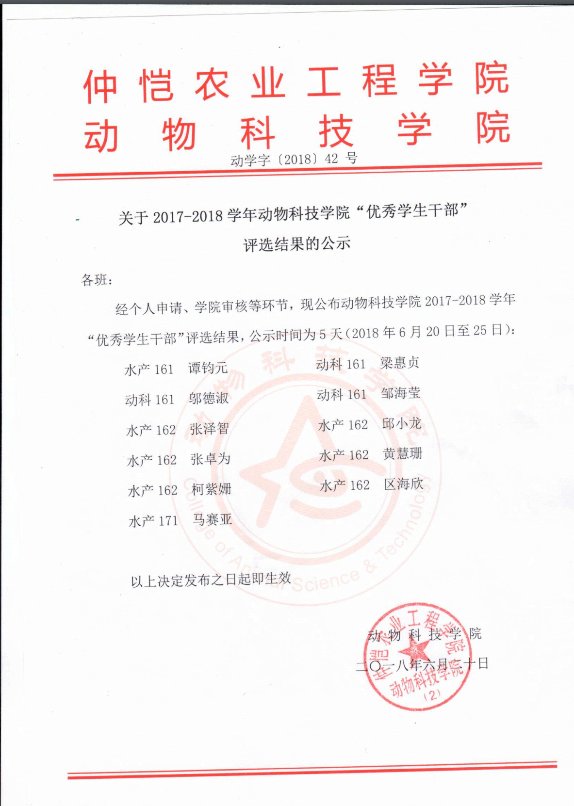 关于2017-2018学年KY开元集团官网入口“优秀学生干部”评选结果的公示