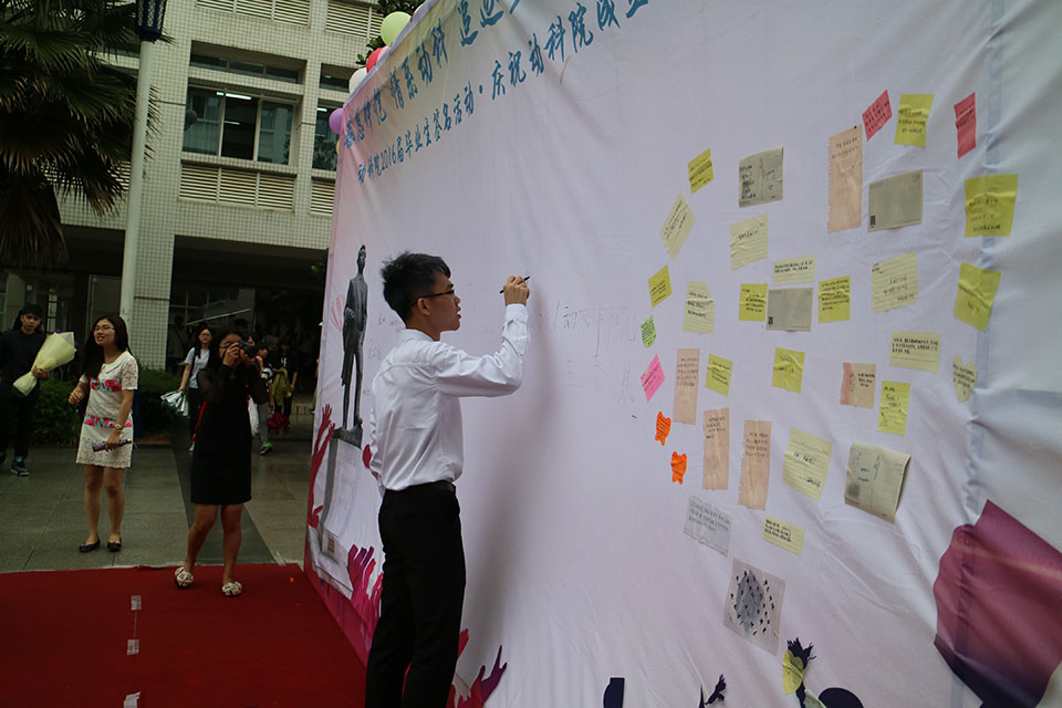 在杨钊杨勋楼和曾宪梓楼中间的广场,一条长长的红地毯和一面以“感恩仲恺情系动科追逐梦想扬帆起航”为主题的签名墙非常醒目。党总支书记曾献尼老师冒雨来到现场,为毕业生送上了“薪薪火相传、梦想成真”的寄语。毕业生们或身着学位服,或正装笔挺,或长裙飘飘,沿着红毯一步一步走到尽头,在签名墙上龙飞凤舞地写上自己姓名,并纷纷拍照留念。