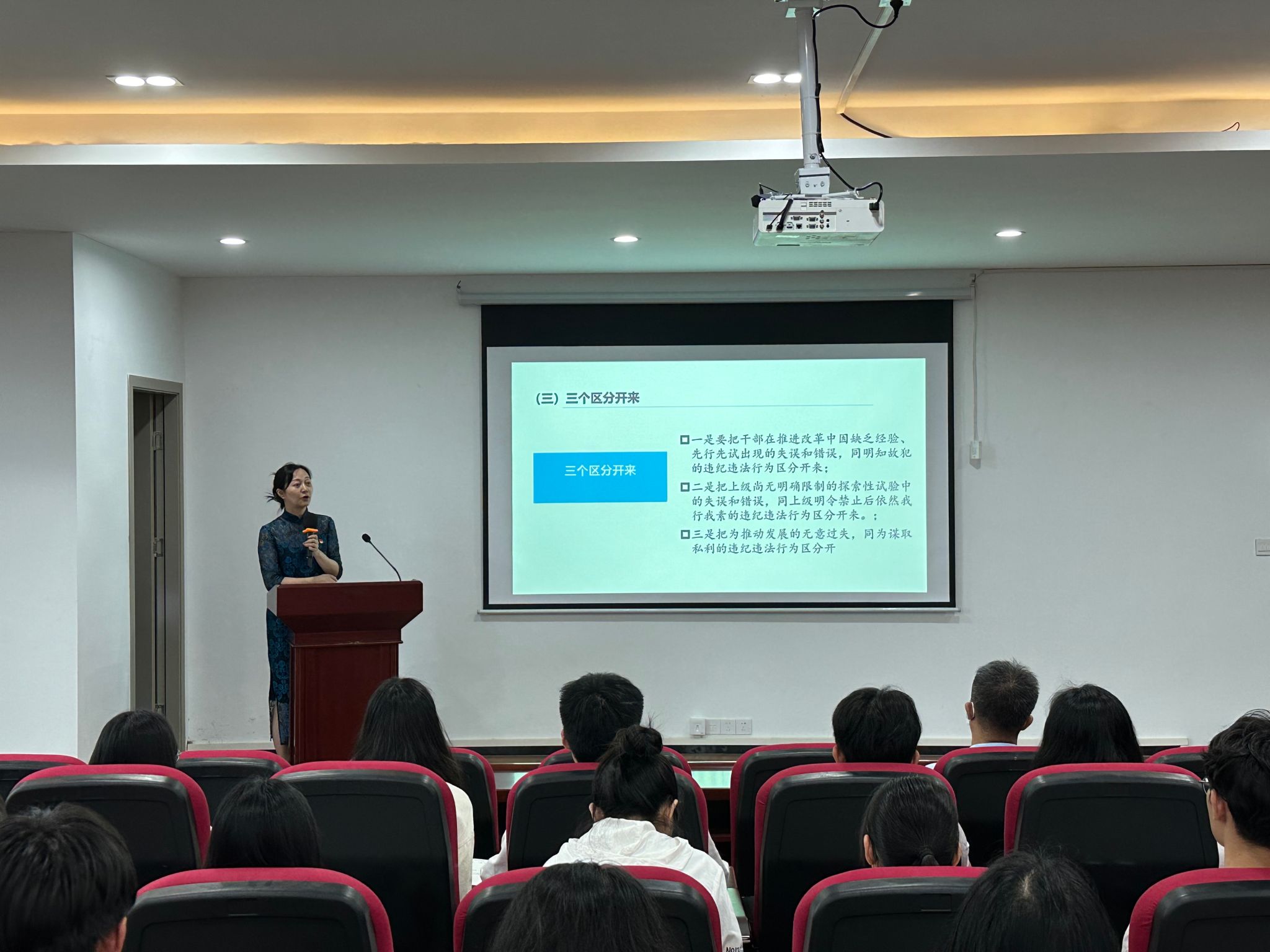 党课上,朱路平从《中国共产党纪律处分条例》的发展演变、修订背景、主要内容以及贯彻落实《条例》四个方面进行了全面深刻解读。授课深入浅出、内涵丰富、分析透彻,引导广大学生党员准确掌握《条例》的主旨要义和规定要求,明确日常言行的衡量标尺,树立学纪、知纪、明纪、守纪意识,为进一步端正学生党员的入党动机,扣好人生的第一粒扣子打下良好基础。