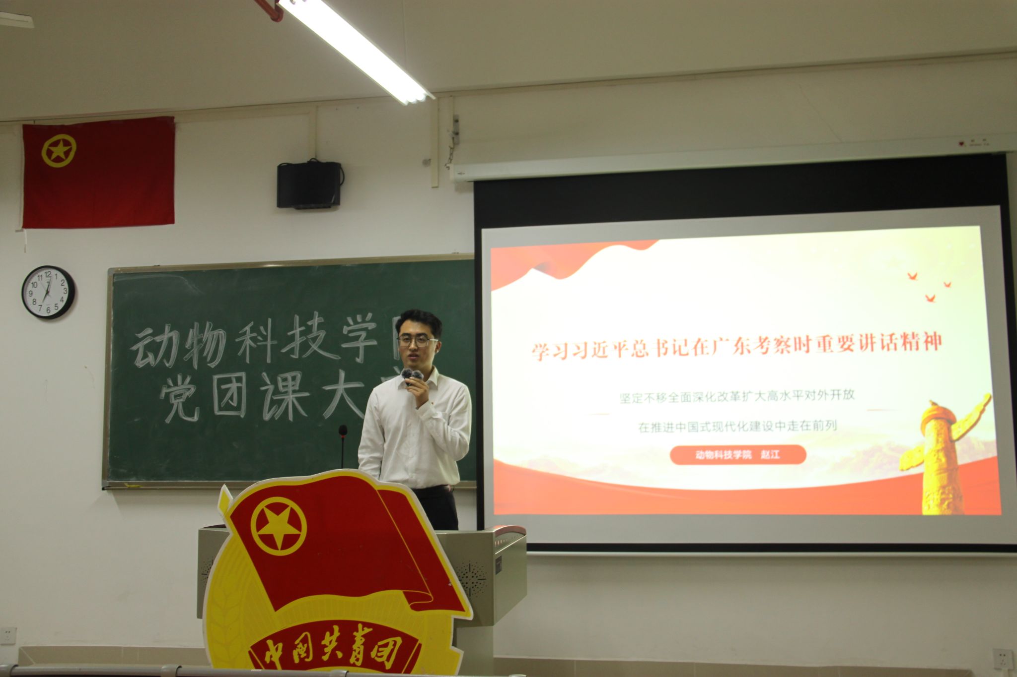 赵江以《学习习近平总书记在广东察的重要讲话精神》为主题向大家授课。他按照总书记此次调考查的线路及讲话内容,为同学们讲解了“大食物观”、民族种业、深海养殖、绿色发展、海洋生态文明建设等一系列重点。他鼓励广大同学要立志做有理想、敢担当、能吃苦、肯奋斗的新时代好青年,并提出“四个要求”:第一,要学习、理解和把握科学发展观的要求和涵义;第二,要做好自己本职工作,学好本领;第三,要积极参加力所能及的社会实践活动;第四,要树立正确的个人发展观。