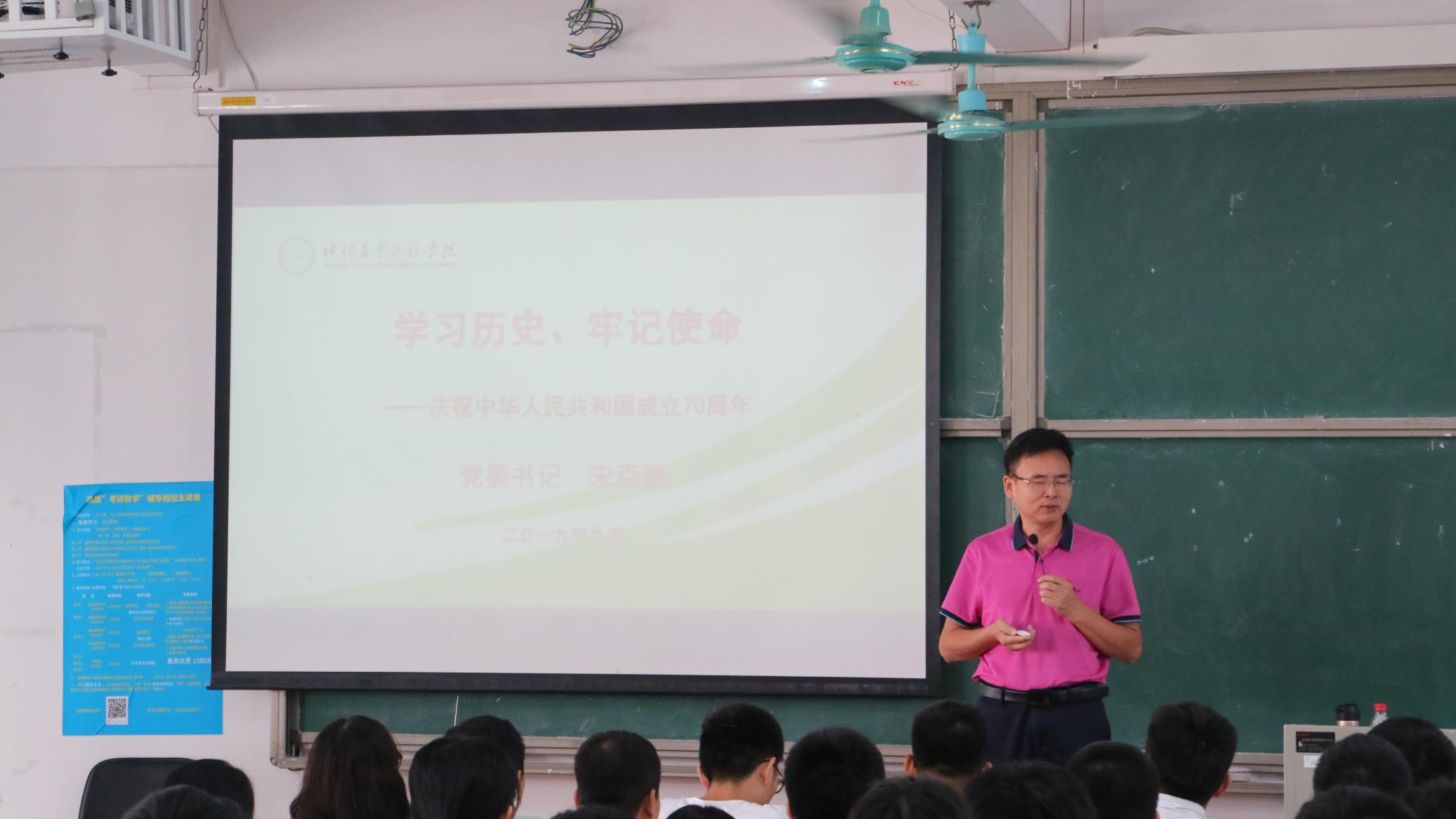 9月25日上午,学校党委书记宋垚臻以“学习历史,牢记使命”为主题,在白云校区杨钊杨勋楼402 为KY开元集团官网入口动科水产专业2018级学生讲授本学期第一堂思政课。