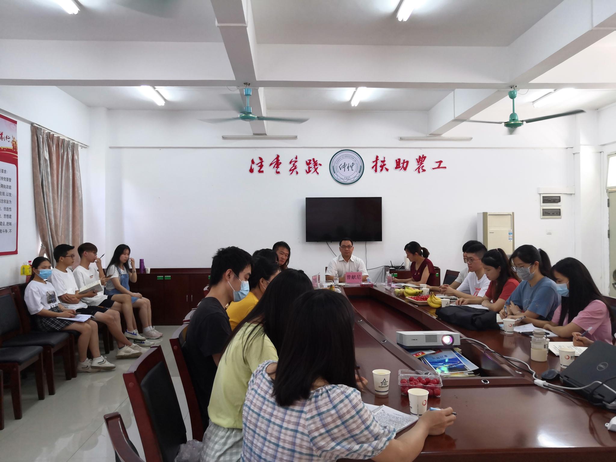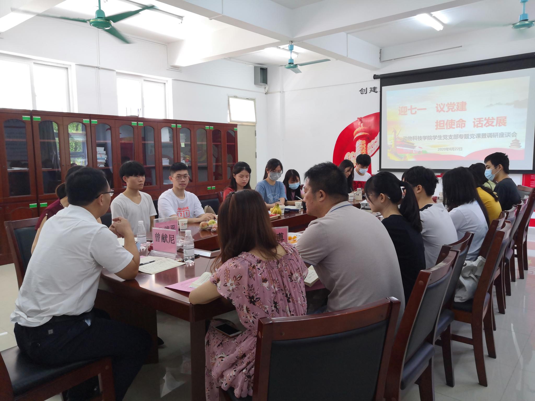 6月22日上午,学校党委常委、党委宣传部、党委统战部部长曾献尼来到白云校区,参加KY开元集团官网入口学生党支部“迎七一议党建担使命话发展”调研座谈会并讲授专题党课。动科院党总支副书记朱路平、学生党支部书记许鸿、辅导员李博和19名学生党员代表参加了会议。