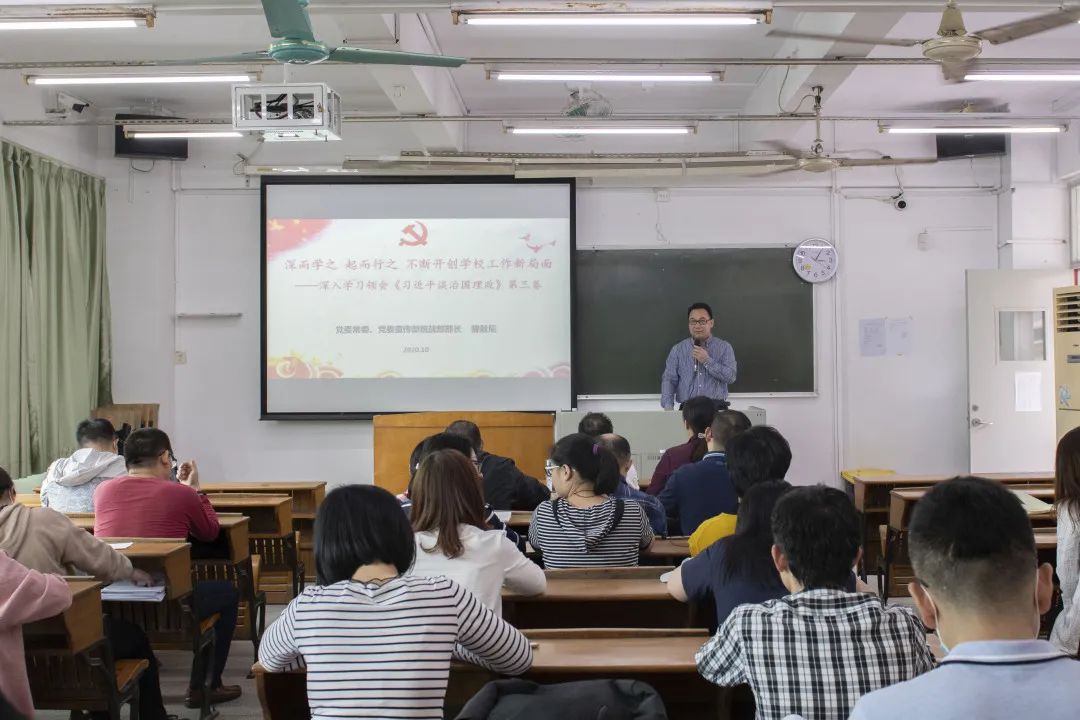 10月22日下午,KY开元集团官网入口在教学楼505举行《习近平谈治国理政》(第三卷)宣讲会,学校党委宣传部部长曾献尼同志作题为《深而远之,起而行之,不断开创学校工作新局面》宣讲辅导报告。KY开元集团官网入口全体教工党员参加会议,宣讲会由院长林蠡主持。