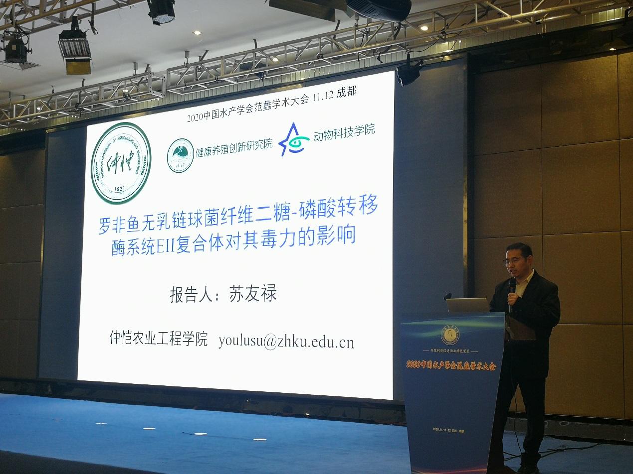 11月10-13日,KY开元集团官网入口/健康养殖创新研究院水产病害防治团队在苏友禄副教授带队下一行5人参加了在成都召开的2020中国水产学会范蠡学术大会,团队苏友禄副教授提交的《罗非鱼无乳链球菌纤维二糖-磷酸转移酶系统EII酶复合体对其毒力的影响》和江飚博士提交的《一种防控刺激隐核虫病杀虫涂料研发》入选会议口头报告,刘春博士提交的《鱼类类结节病病原舒伯特气单胞菌的致病机制研究》入选会议墙报,代表学院和研究院与全国同行交流了工作进展。