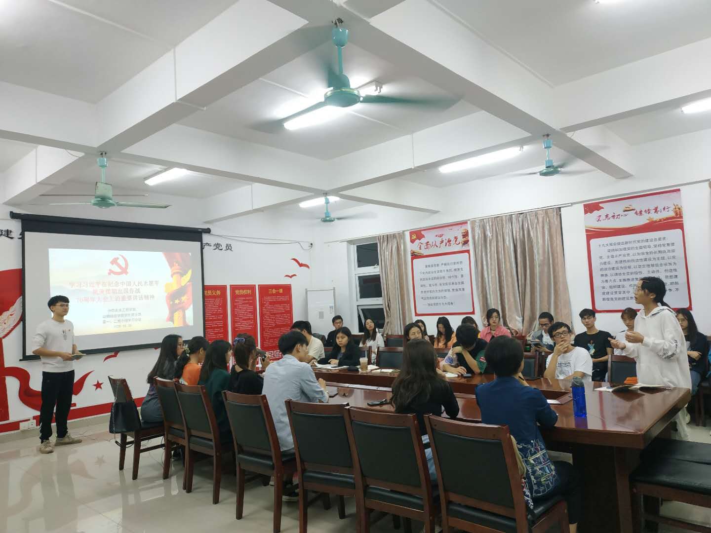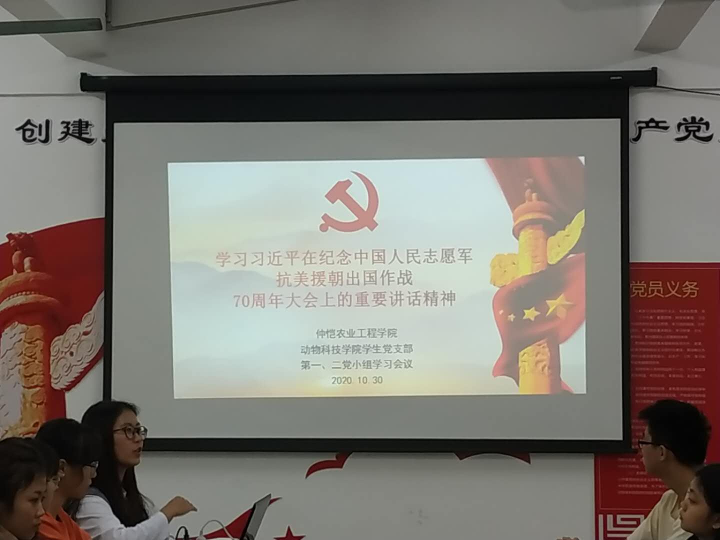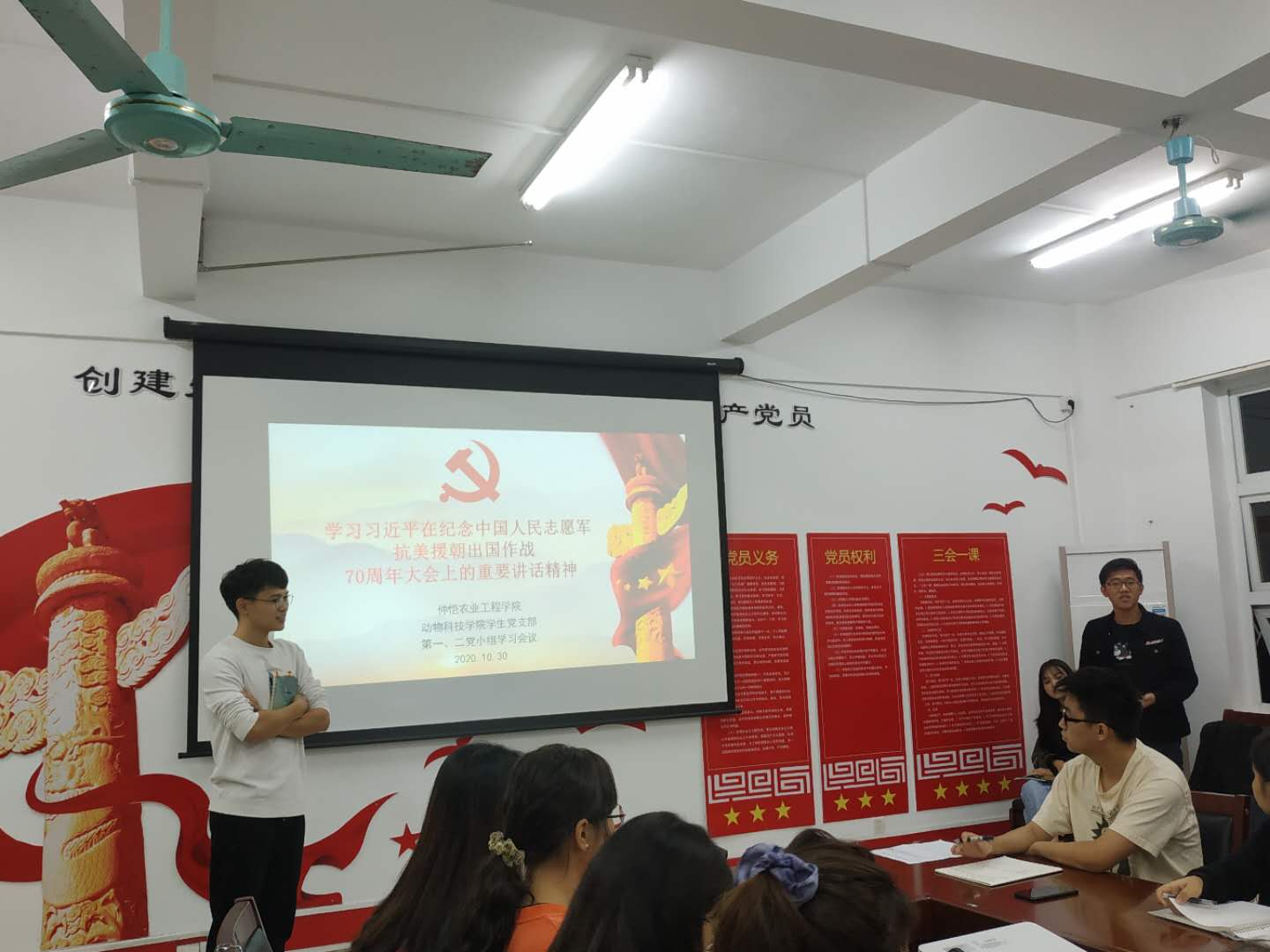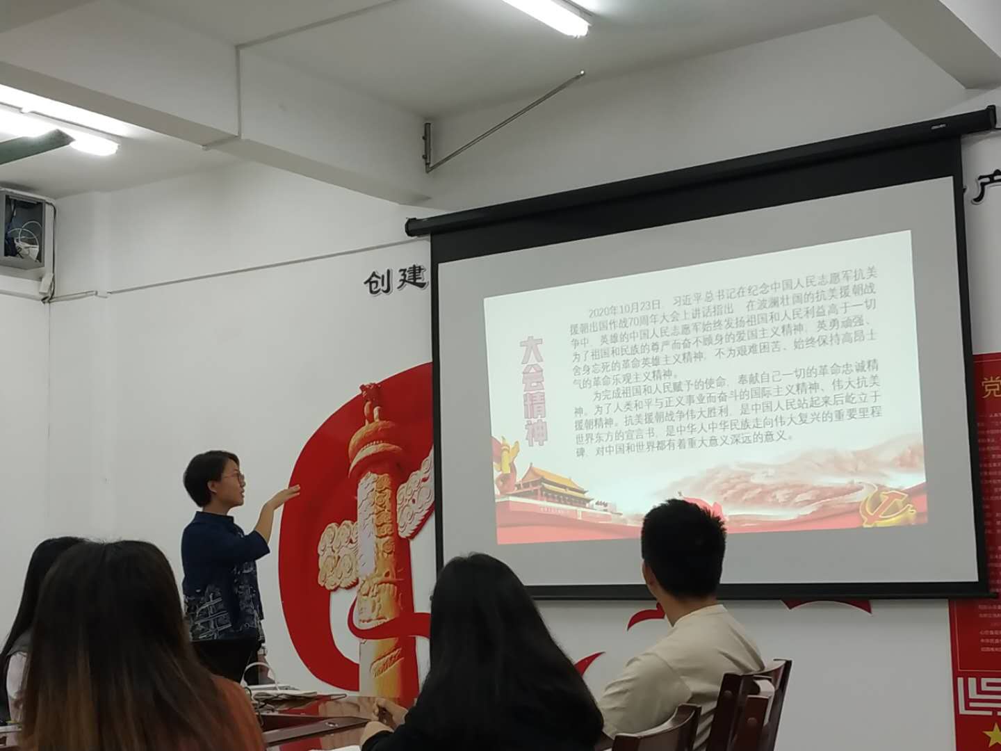 2020年10月30日晚,KY开元集团官网入口学生党支部在党员活动室314开展“学习习近平总书记在纪念抗美援朝作战70周年大会上的讲话精神”活动。会议由党员谭韬主持。