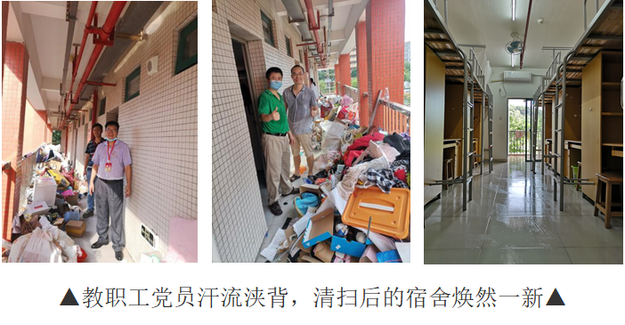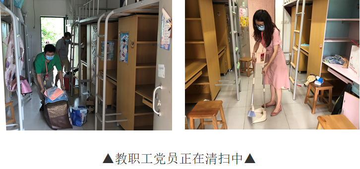 按疫情防控要求,6月底毕业生分批离校,而7月初2018级女生宿舍搬迁行动迫在眉睫。一环扣一环的工作,时间紧、任务重、要求高、责任大。经提前入室检查,宿舍区还积攒了大量的废弃物品来不及清扫,物业服务人员已经忙得不可开交,应接不暇。为了保证学生能顺利地进驻新宿舍,7月1日,教工党员志愿队先头部队在党总支书记欧坚泉的带领下,来到白云校区,对即将迁入的宿舍进行清理打扫,以实际行动践行初心担当使命,开展了一次特殊主题的党日活动,向党的生日献礼。