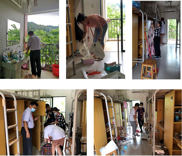 正午骄阳时,在党总支书记欧坚泉、副书记朱路平的带领下,10名教工党员志愿者和2名学生志愿者来到18栋宿舍区。志愿队员们分配好任务,克服困难,团结协作,发扬不怕脏不怕累的精神,积极投入清扫工作。坚持不落下任何一间宿舍,不留下任何一个死角。汗水挂满额头,湿透了衣背,忙碌的身影筑成一道道亮丽风景线,定格在这个特殊的日子里。经过了两个多个小时不停歇的辛勤劳动,大家终于完成了全面清扫新宿舍的志愿活动。打扫后的宿舍一改当初的杂乱景象,变得整洁明亮了。教工党员在关键时期体现了众志成城的大局意识、挺身而出的责任意识和担当作为的奉献精神,以实际行动弘扬优良传统和踏实作风,将党员能量和爱的温度传递给学生。