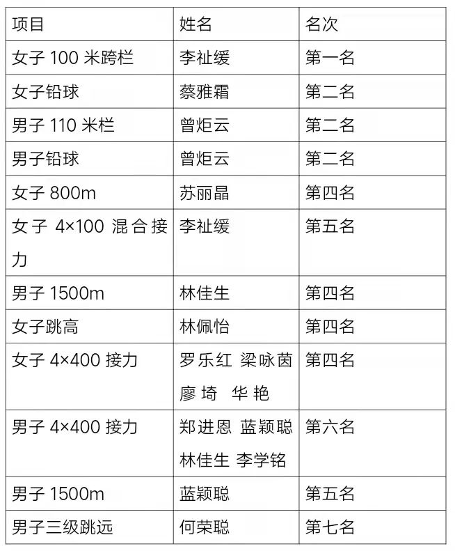 KY开元集团官网入口今日赛程有男子铅球决赛、女子铅球决赛、男子跳远决赛、女子跳远决赛、男子100米预赛、女子100米预赛、男子110米栏决赛、女子100米栏决赛、男子400米决赛、女子400米决赛等。田径场上的运动员踏着矫健的步伐跑向胜利的终点,席上的观众高呼“加油”。他们的目光紧紧跟随着参赛选手,他们的神情随比赛结果而变换,他们的表现与运动员紧密相关。在热情的加油声中,KY开元集团官网入口参赛选手取得了优秀的成绩。以下是KY开元集团官网入口参赛选手具体获奖情况: