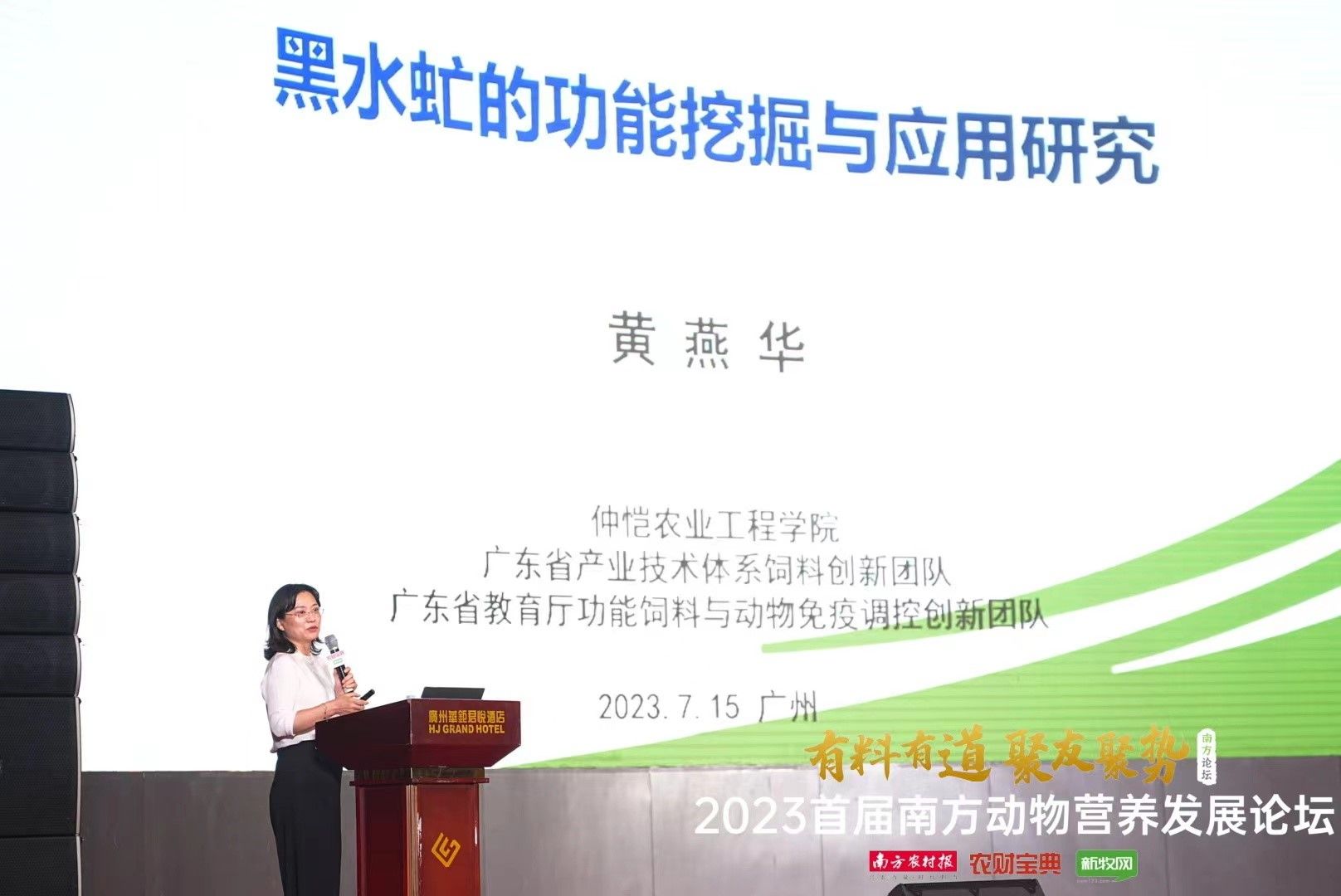 7月15日上午,首届南方动物营养发展论坛正式开幕,黄燕华教授主持了上午院士专题报告和下午水产分会场的圆桌论坛环节,并在水产会场作了《黑水虻的功能挖掘与应用研究》专题报告,分享了黑水虻从饲料原料到功能性饲料添加剂的研发与应用研究进展,介绍了研究团队的成果,助推新型昆虫饲料资源黑水虻产业发展。