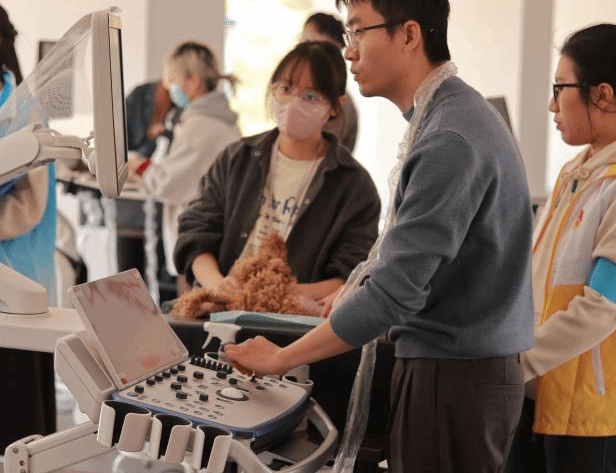 在宠物影像赛中,选手们需要将待检犬只保定好,将其腹部剃毛后进行超声检查。参赛者们通过 B 超技术,将宠物的内脏器官和内部结构清晰地呈现在屏幕上,通过扫查肝脏、胆囊、脾脏等腹腔内的器官查看宠物的健康状况。